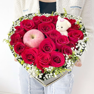 19枝精品红玫瑰、1颗苹果,黄莺、白色满天星外围、随机搭配1个小熊