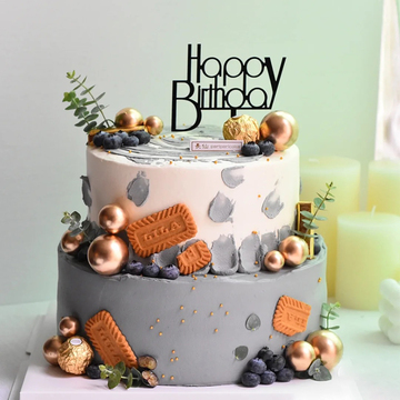 双层圆形鲜奶蛋糕,水果夹层,蓝莓、尤加利叶、焦糖饼干、巧克力、金色珠子如图装饰。
