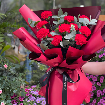 11朵红色康乃馨,尤加利叶点缀。