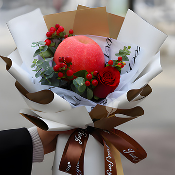 1枝红玫瑰、1颗苹果,红豆尤加利叶搭配