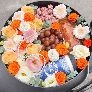 5支香槟玫瑰,5支粉色非洲菊,暖冬四件套:1杯霸王茶姬奶茶,250g山楂球,250g糖炒栗子,1个烤红薯,搭配白桔梗,粉桔梗(喷色),橙色多头泡泡,尤加利叶丰满间插,表面一串珠链装饰