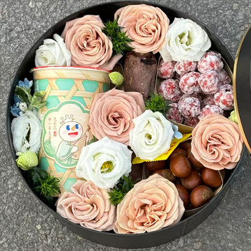 6支卡布奇诺玫瑰,暖冬四件套:1杯蜜雪冰城奶茶,250g山楂球,250g糖炒栗子,1个烤红薯,搭配松竹草(如缺货用蓬莱松替代)、白桔梗、蓝星花丰满间插