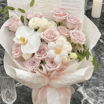 11支曼塔玫瑰,1朵白色蝴蝶兰,1支白色郁金香,搭配白桔梗,小盼草丰满间插