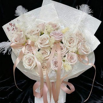 16支曼塔玫瑰,搭配白色蓬莱松,白羽毛,表面如图装饰蝴蝶结