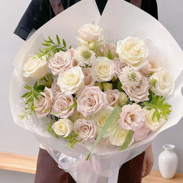 11支曼塔玫瑰,8支白玫瑰,搭配白色蓝盆花,白桔梗,粉桔梗,九星叶,喷泉草丰满间插