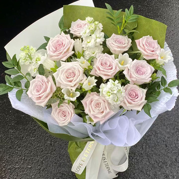 由于鲜花包扎各地的花艺师不同,可能在花束的形式和搭配上与图片不完全一致,但我们保证鲜花的主花材品种、新鲜程度、数量、颜色与说明一致,谢谢。