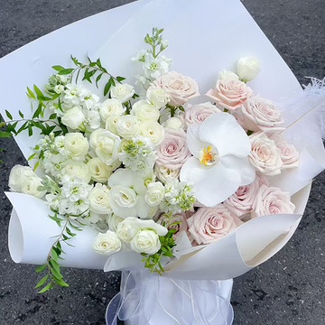 13支曼塔玫瑰,1朵白色蝴蝶兰,6支白桔梗,6支白色紫罗兰,搭配白羽毛,九星叶丰满间插