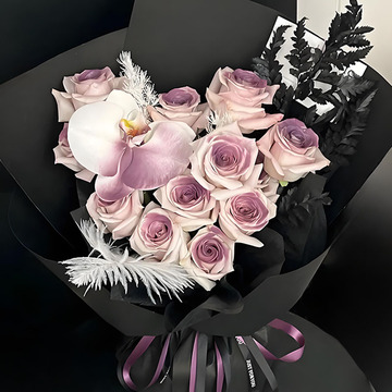 11支乌梅子酱玫瑰,1朵紫色蝴蝶兰(喷色),搭配黑色高山羊齿(喷色),白羽毛,白色蓬莱松丰满间插
