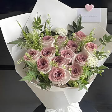 13支乌梅子酱玫瑰,搭配白色蕾丝,绿铃草,九星叶丰满间插
