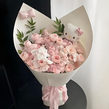 19支仙子之吻多头玫瑰(掰开造型),3朵白色蝴蝶兰,搭配九星叶丰满间插,1个KT猫玩偶装饰