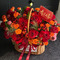 16支红玫瑰(翻瓣),搭配橙色多头泡泡,巧克力多头泡泡,九星叶,红豆,粉色康乃馨,绿桔梗,喷泉草丰满间插