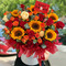 6支向日葵,14支红玫瑰,4支香槟玫瑰,9支橙色多头泡泡,搭配尤加利叶丰满间插